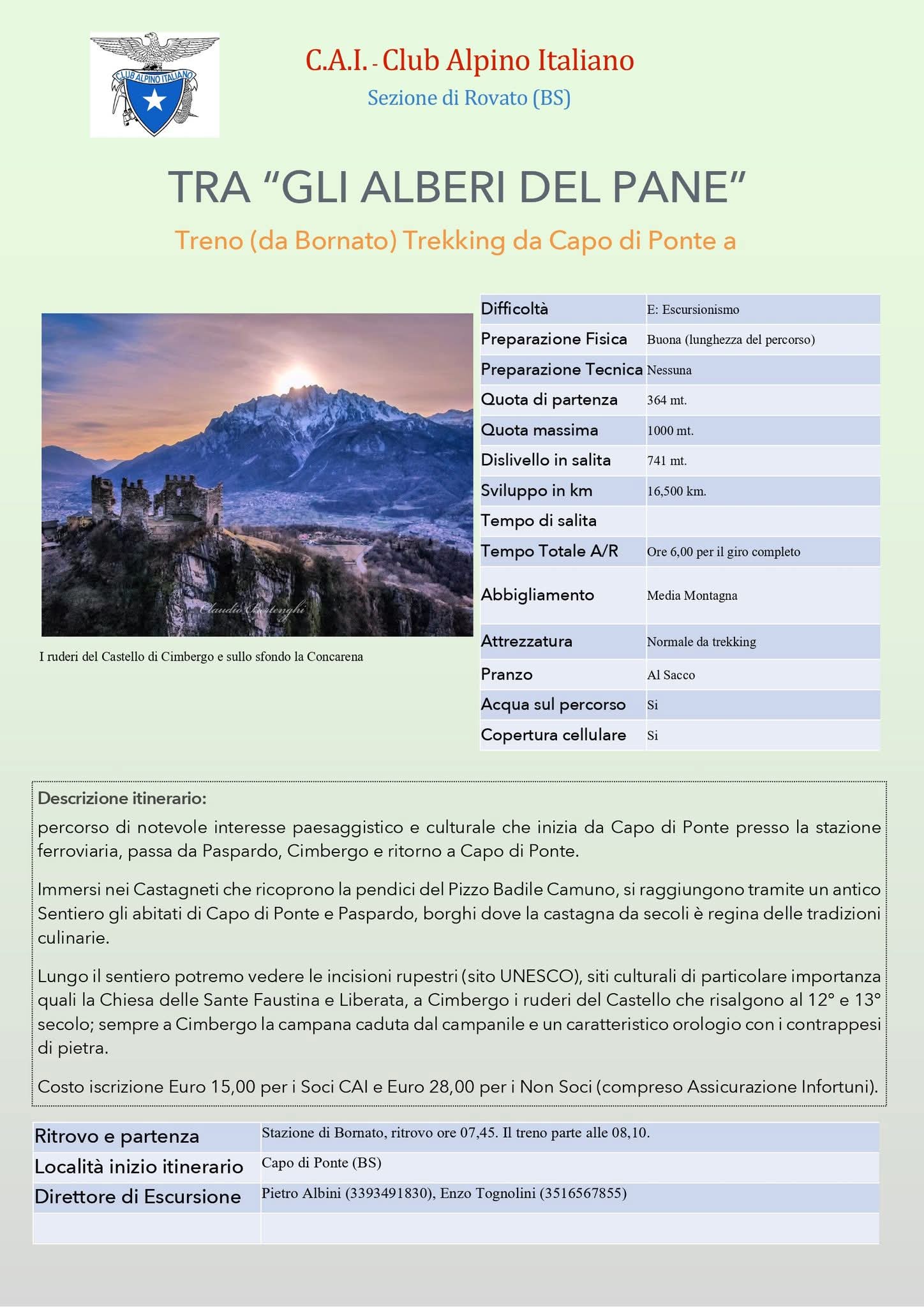 Ritrovo e partenza: Stazione di Bornato alle ore 7.45 (il treno parte alle 8.10) Inizio itinerario: Capo Di Ponte (BS) Direttori di escursione: Pietro Albini, Enzo Tognolini