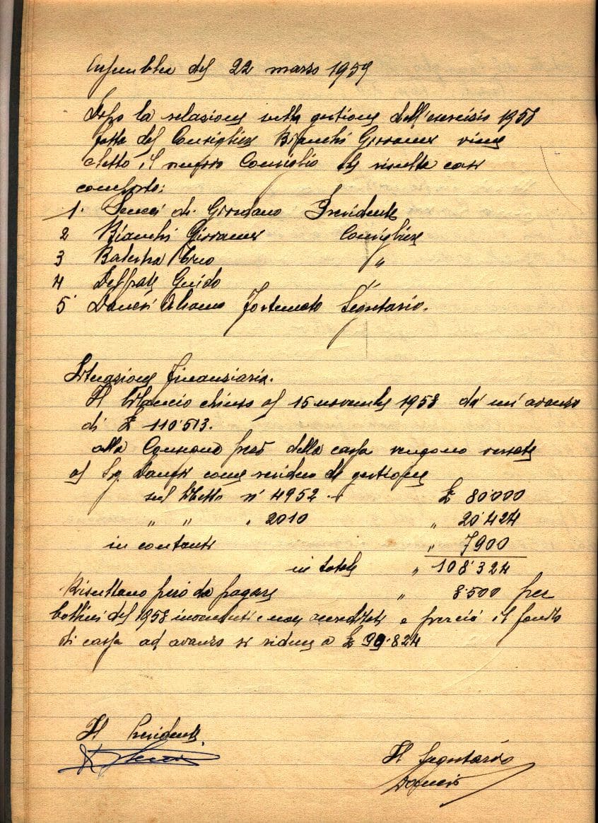 "Dopo la relazione sulla gestione dell'esercizio 1958 fatta dal Consigliere Bianchi Giovanni viene eletto il nuovo Consiglio che risulta così composto: