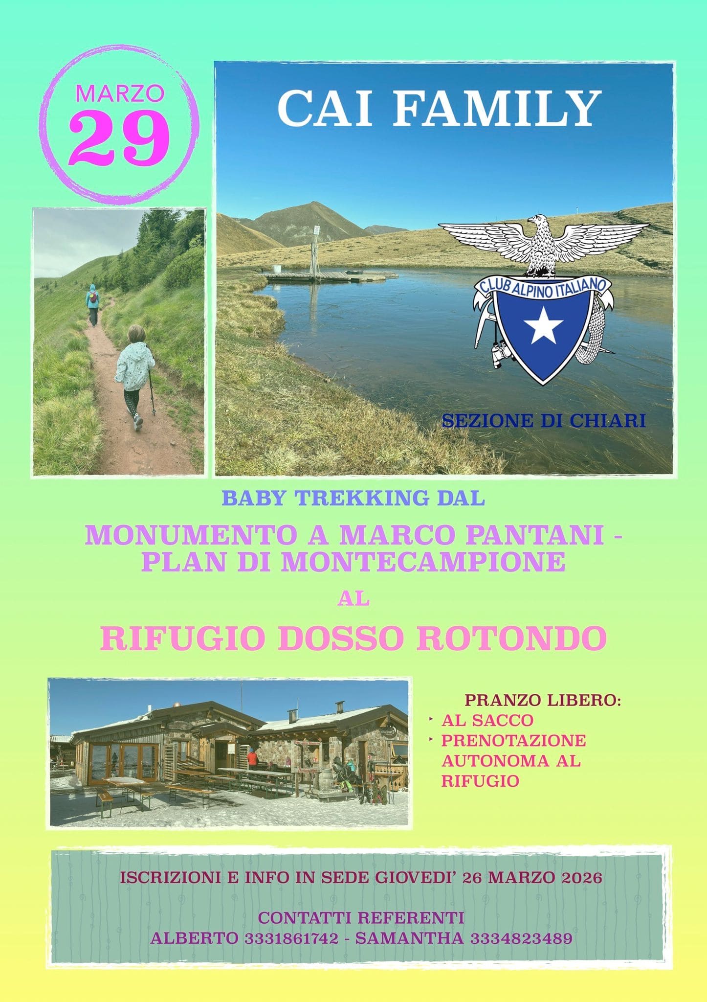 Prosegue l’attività del Gruppo Family con un nuovo appuntamento; pur restando nella nostra bella provincia, ci portiamo a quota 1700-1800m nella località Plan di Montecampione, per godere dell’aria fresca tra i verdi pascoli coperti da quel che resta del manto nevoso invernale. Iniziamo a scaldare le gambe con un piccolo dislivello!