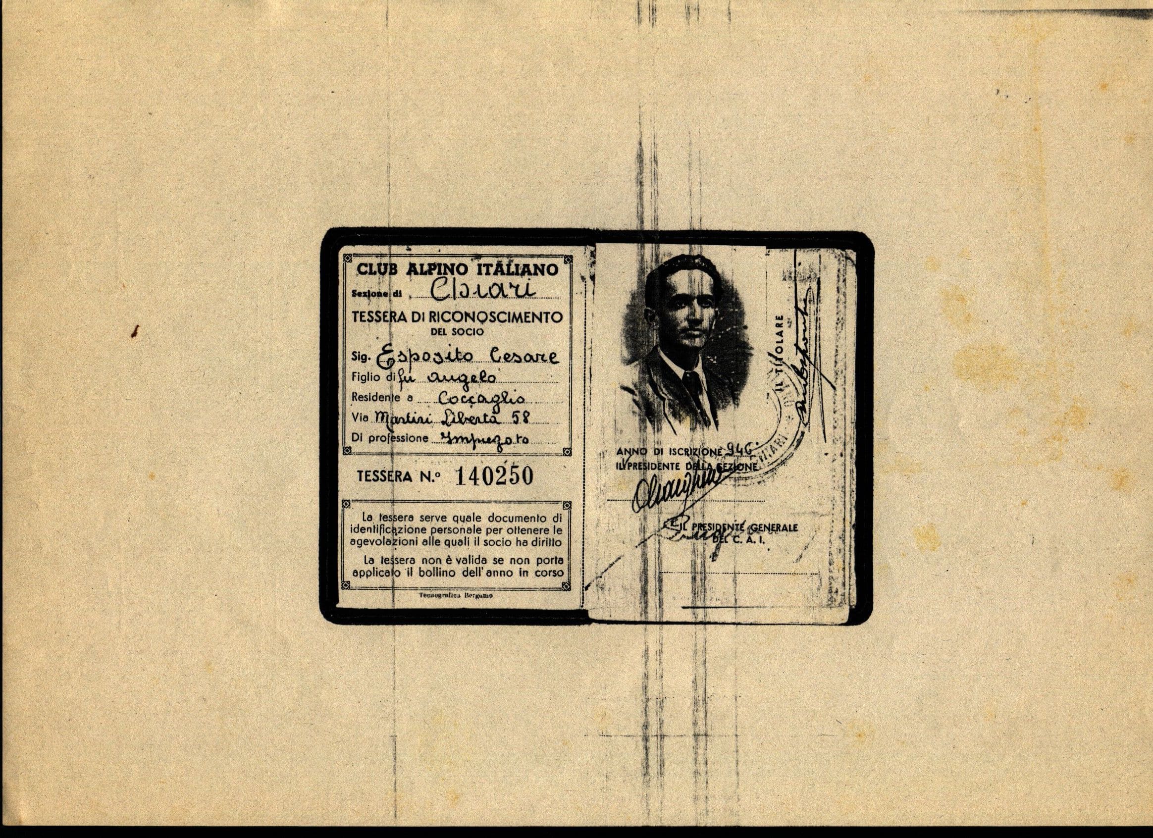1) Lettera di Cesare Esposito su cartolina postale datata 22 febbraio 1961 (fronte e retro) con allegata copia fotoscatice della tessera