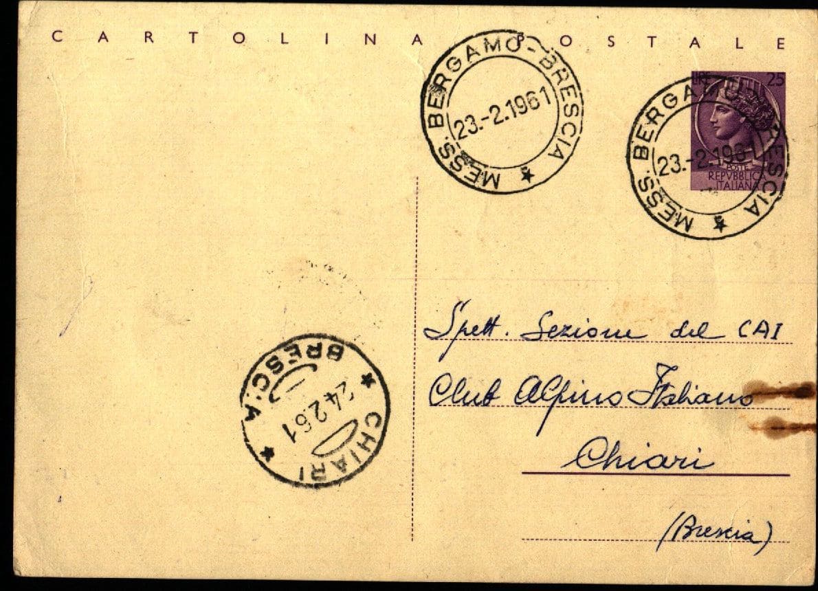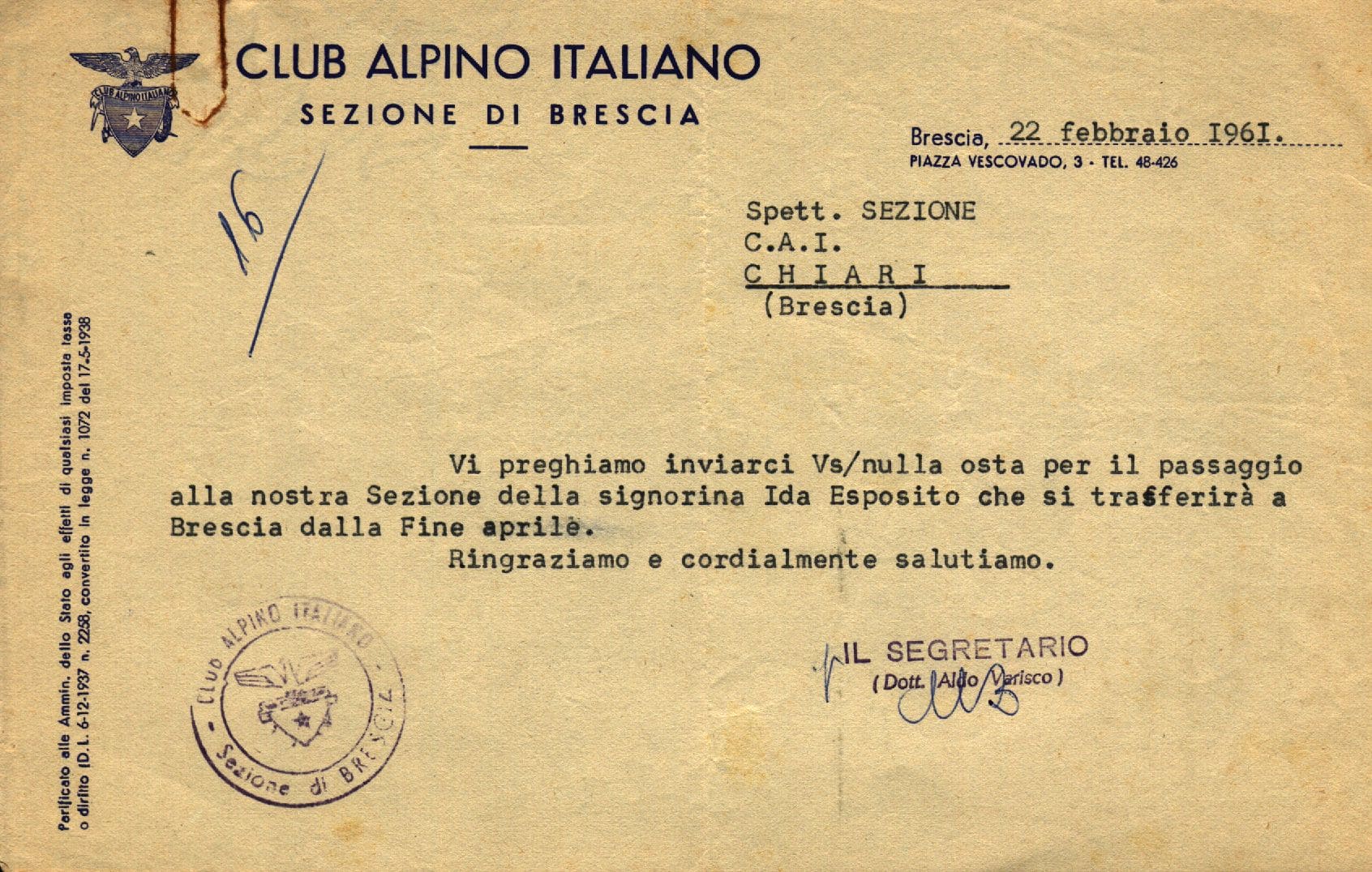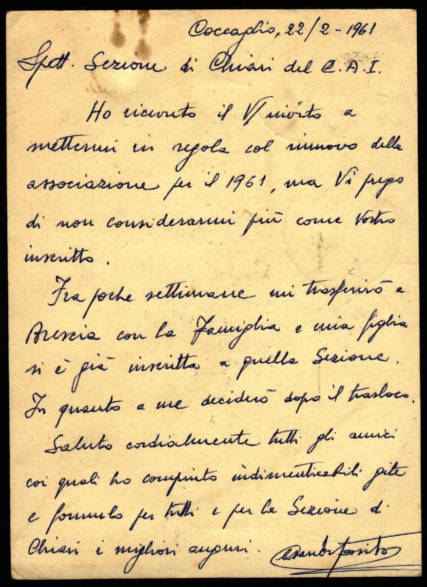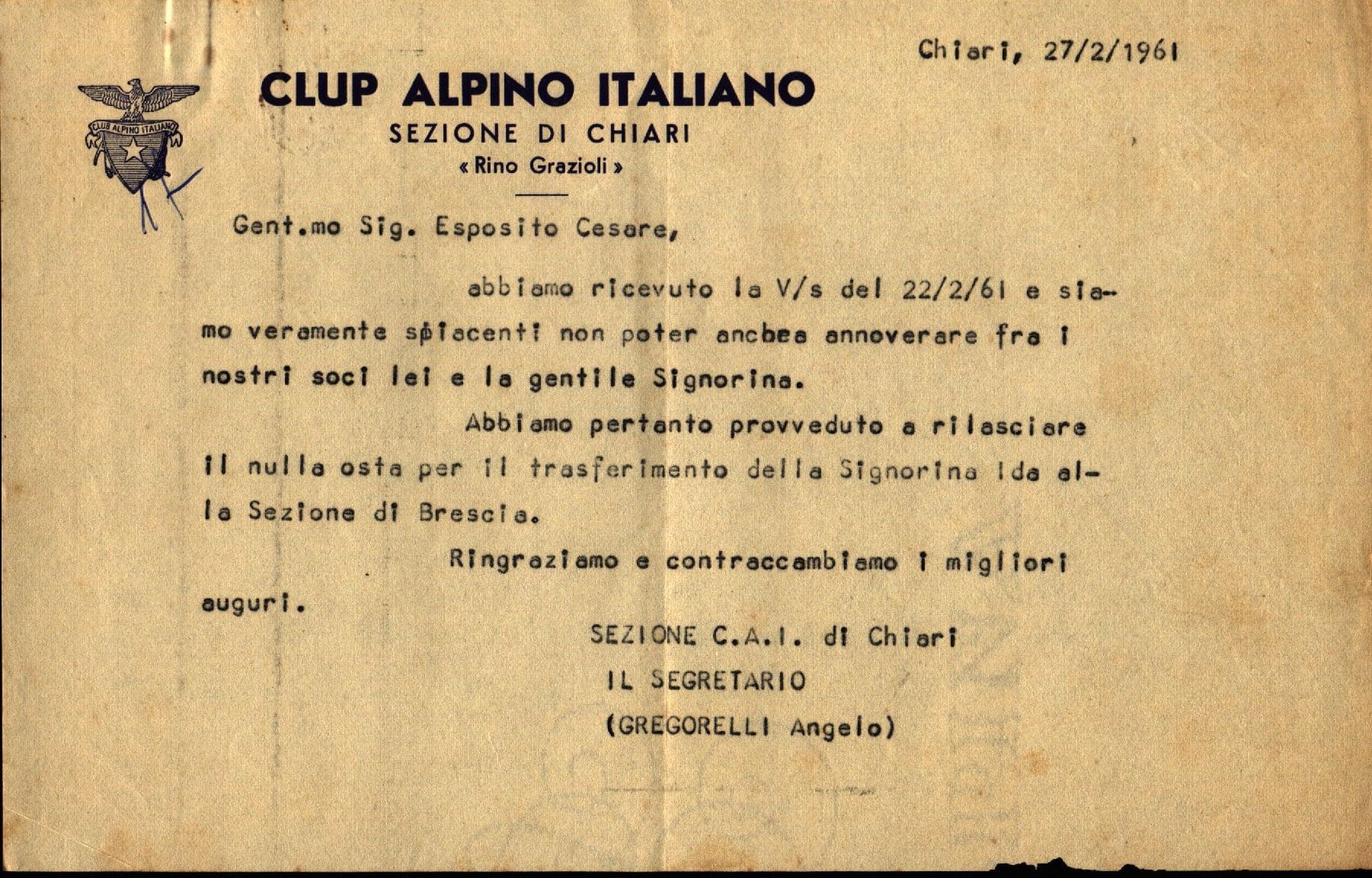 2) Lettera datata 22 febbraio 1961 e firmata dal Segretario Aldo Varisco del CAI di Brescia verso Cai Chiari per conferma trasferimento