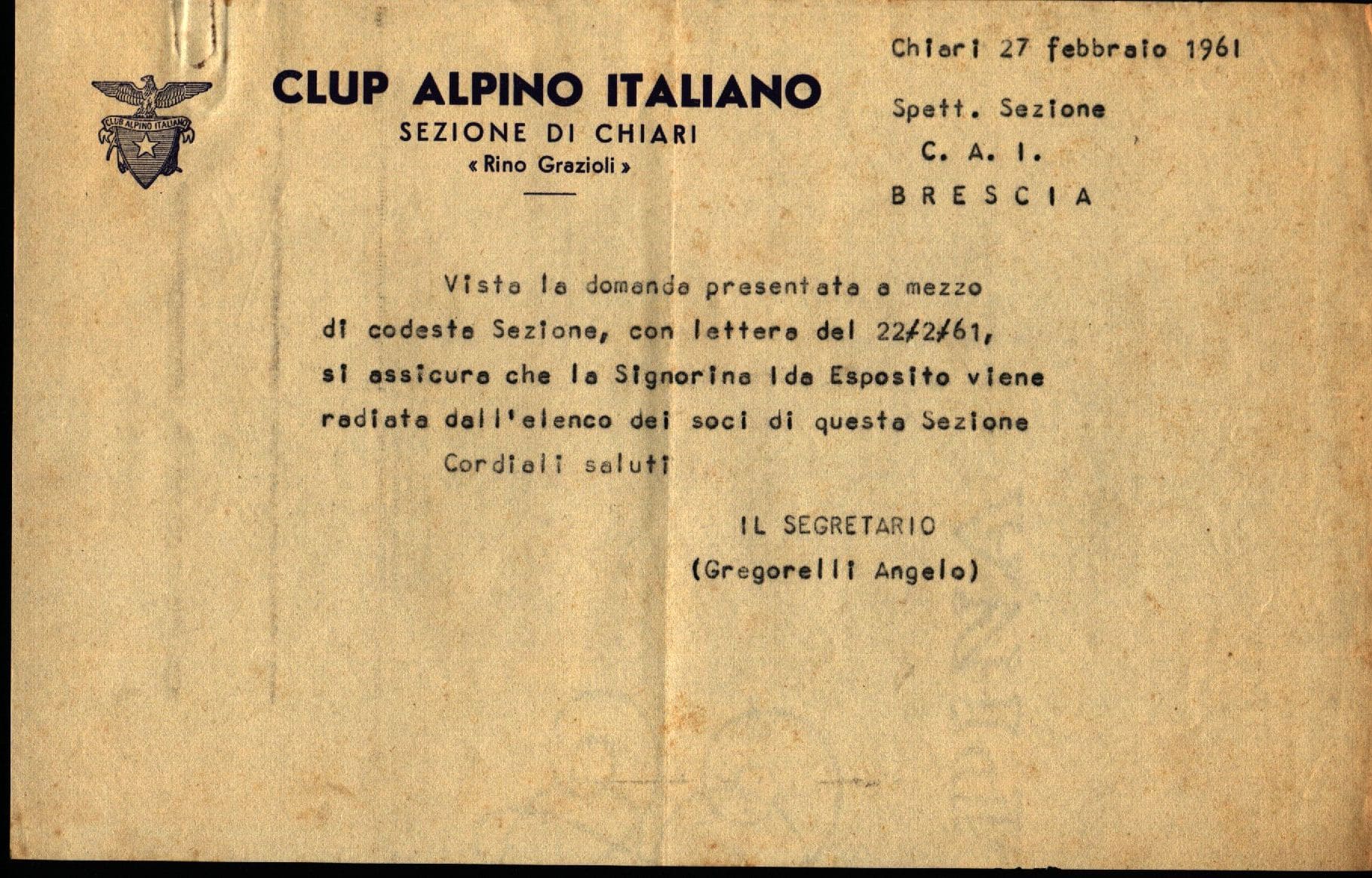 4) Lettera datata 27 febbraio 1961, inviata dal segretario Angelo Gregorelli del CAI di Chiari a CAI Brescia circa la radiazione della signorina Ida Esposito