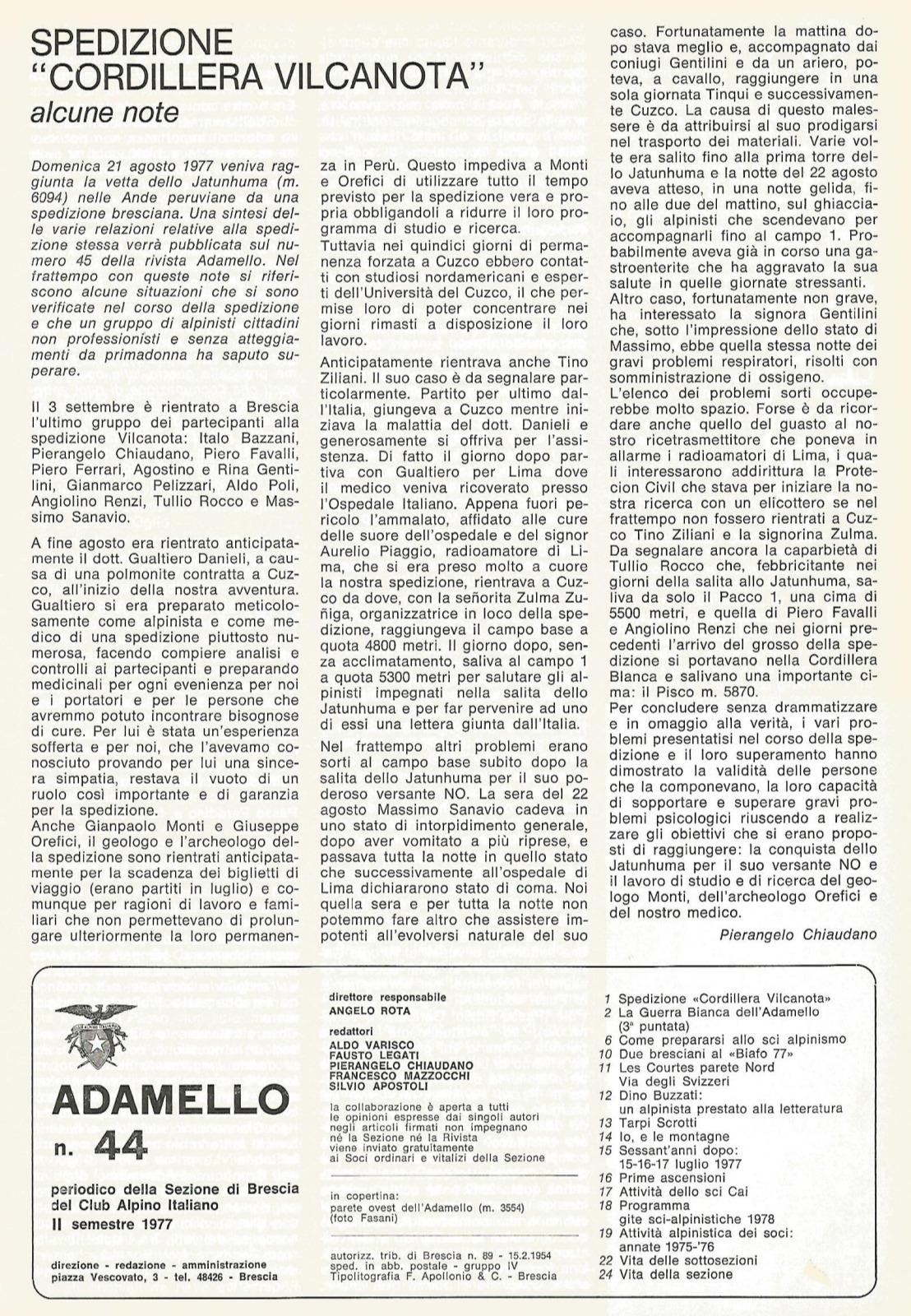 1977 n° 44 | ADAMELLO: Tullio Rocco - Spedizione "Cordillera Vilcanota" alcune note