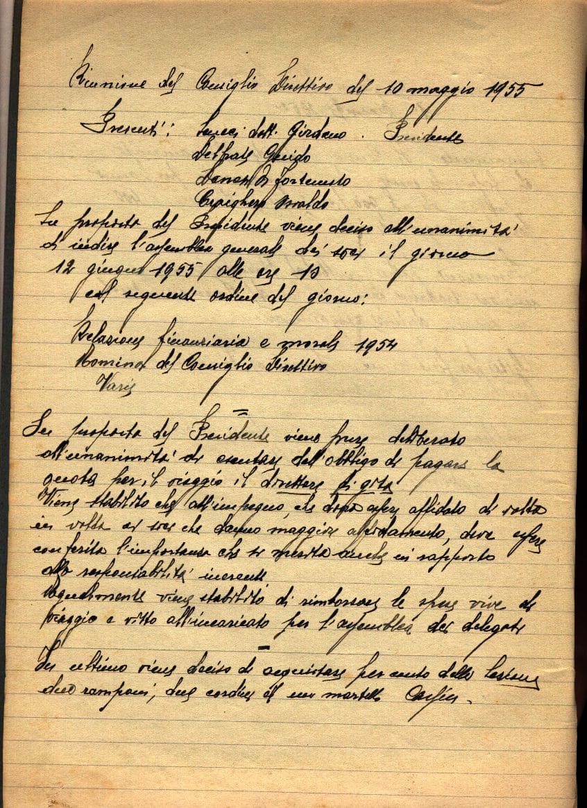 Su proposta del Presidente viene deciso all'unanimità di indire l'assemblea generale dei soci il giorno 12 giugno 1955 alle ore 10 col seguente ordine del giorno: