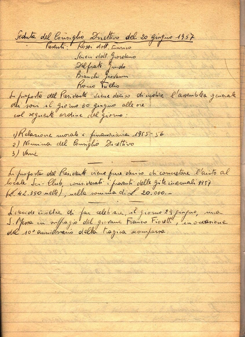 Su proposta del Presidente viene pure deciso di concretare l'aiuto al locale Sci.Club, considerati i proventi delle gite invernali 1957 (Lit. 42.350 nette), nella somma di Lit. 20.000.