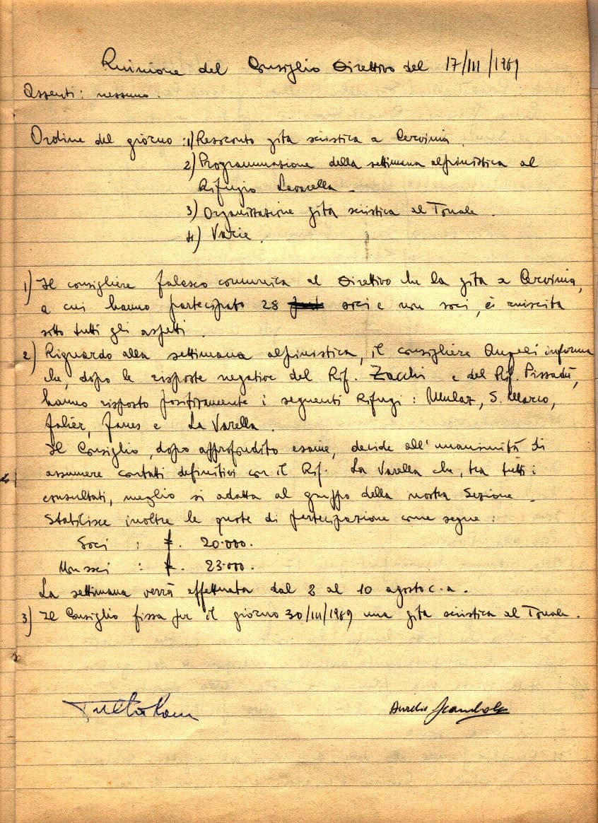 Nella discussione si decide, dopo aver vagliato la disponibilità di vari rifugi, su proposta del consigliere Angeli, di effettuare la settimana alpinistica dal 2 al 10 agosto presso il rifugio La Varella [Lavarella ndr]