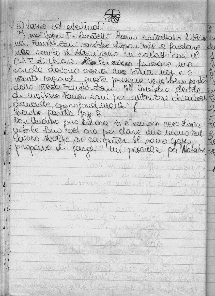 Nell'ODG: Punto 3) Varie ed eventuali. [...] i soci Vagni F e Locatelli hanno contattato l'istruttore naz. Fausto Zani [che ndr] sarebbe disponibile a fondare una scuola di Alpinismo in contatto con il CAI di Chiari [...] Il consiglio decide di invitare Fausto Zani per ulteriori chiarimenti, domande, approfondimenti. [...]
